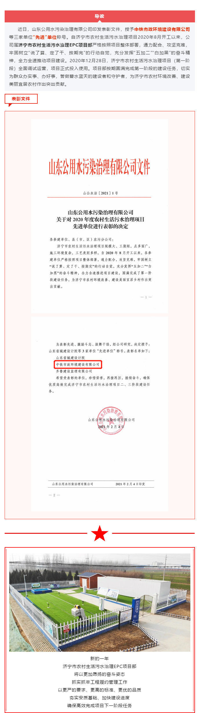 濟寧市農(nóng)村生活污水治理EPC項目部再添新譽