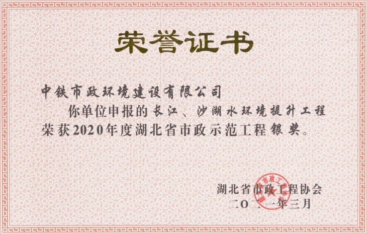 近日,2020年湖北省市政示范工程評選結(jié)果公布,公司長江、沙湖水環(huán)境提升工程項目喜獲湖北省市政示范工程銀獎。