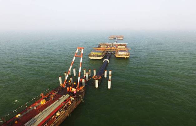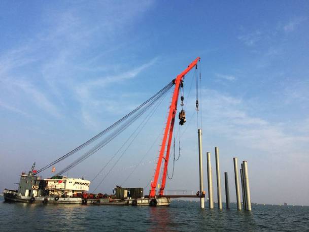 此次建設(shè)者們面對(duì)的是直徑2.6米,沉管長(zhǎng)度228米,水深超過(guò)20米的水下鋼管鋪管施工,因?yàn)槠涑笾睆健⒊L(zhǎng)沉管、超深水域的特點(diǎn),被業(yè)界稱(chēng)為國(guó)內(nèi)最深水下鋪管工程,施工難度極大。項(xiàng)目開(kāi)工之后,建設(shè)者們就遇到第一個(gè)難題,水下沉管首先需要在平均深度達(dá)到20米的湖底打下93根鋼管樁,以3根為一橫排,豎排31根要保持在一個(gè)直線(xiàn)上,以便水下沉管固定安裝。由于水深關(guān)系,以現(xiàn)有彈簧振動(dòng)樁錘或者液壓式?jīng)_擊錘,難以達(dá)到深水樁基進(jìn)度要求,為此,建設(shè)者們創(chuàng)新研制了新型深水樁基送樁器,其本體由上、下兩部分組成,上部分采用上部鋼管,在所述上部鋼管的外表面由上至下標(biāo)有刻度尺,用于控制貫入度及施打深度;下部分采用下部鋼管,上下兩部分通過(guò)上下部分連接件銜接,分別與上下部分鋼管焊接,在與上下部分焊接部位沿著鋼管周側(cè)等間隔設(shè)有若干加勁板。 通過(guò)新型深水樁基送樁器使用,保證了深水打樁垂直度、貫入度、樁頂標(biāo)高。