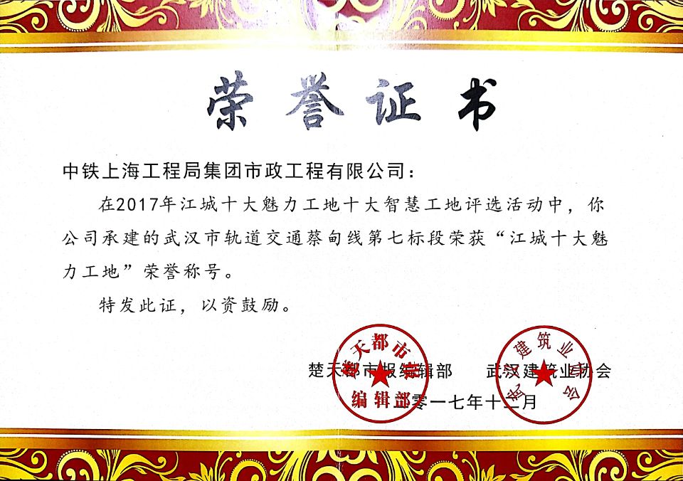 1月7日,江城“十大魅力工地”“十大智慧工地”頒獎(jiǎng)儀式在武漢市楚天傳媒大廈楚天會(huì)堂隆重舉行。由市政公司承建的武漢市軌道交通蔡甸線第七標(biāo)段項(xiàng)目喜獲“十大魅力工地”稱(chēng)號(hào),這也是中鐵上海局自進(jìn)入武漢市場(chǎng)以來(lái)首次獲得該項(xiàng)榮譽(yù)。