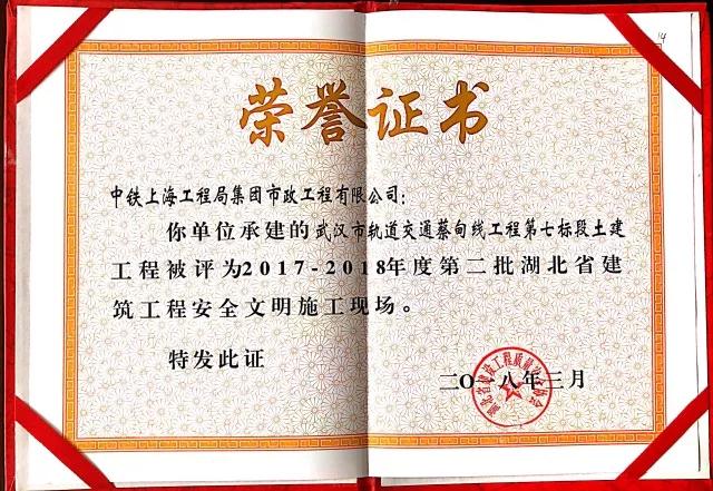 日前,從湖北省建設工程質(zhì)量安全協(xié)會傳來喜訊,中鐵上海工程局集團市政公司承建的武漢市軌道交通蔡甸線工程第七標段土建工程榮獲“湖北省建筑工程安全文明施工現(xiàn)場”榮譽稱號。
